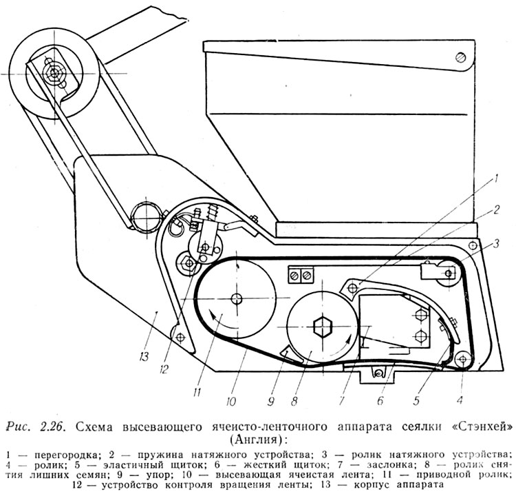 Рис. 2.26. Схема высеивающего ячеисто-ленточного аппарата сеялки «Стэнхей» (Англия).