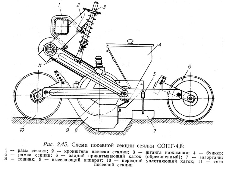 Секции этой сеялки двухопорные с параллелограммной подвеской, сошник килевидный с туаым углом вхождения. Задний прикатывающий каток является одновременно «присошниковым», т. е. он прижимает семена ко дну борозды до засыпки ее землей. Сеялка оборудована комкоотводом. Засыпка борозды (семян) почвой осуществляется с помощью загортача [148, 599].