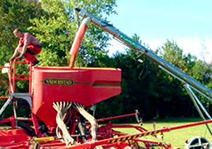 Загрузчики сеялок (шнек — загрузчик семян или удобрений) — комплект оборудования для механизированной загрузки ящиков сеялок семенами. Наклонный шнек — загрузчик поднимает семена к горизонтальному шнеку с брезентовым рукавом на конце для направления семян в ящик сеялки. При необходимости семена протравливают сухими ядохимикатами. Шнеки загрузчики сеялок (загрузчики семян) приводятся в действие от коробки отбора мощности автомобиля или от гидравлики. Загрузчики сеялок (шнеки — загрузчики семян) обслуживают шофёр и сеяльщик, которые заправляют трёхсеялочный агрегат за 3-4 мин. Для загрузки на ходу сеялки оборудуют предохранительными буферами. Шнеки — загрузчики сеялок (семян) используют для загрузки зерна и сыпучих минеральных удобрений. Устанавливается шнеки загрузчики сеялок взамен заднего борта самосвала (грузового автомобиля (ЗИЛ, Камаз, Маз и прицепы трактора). | ||||||||||||||||||||||||